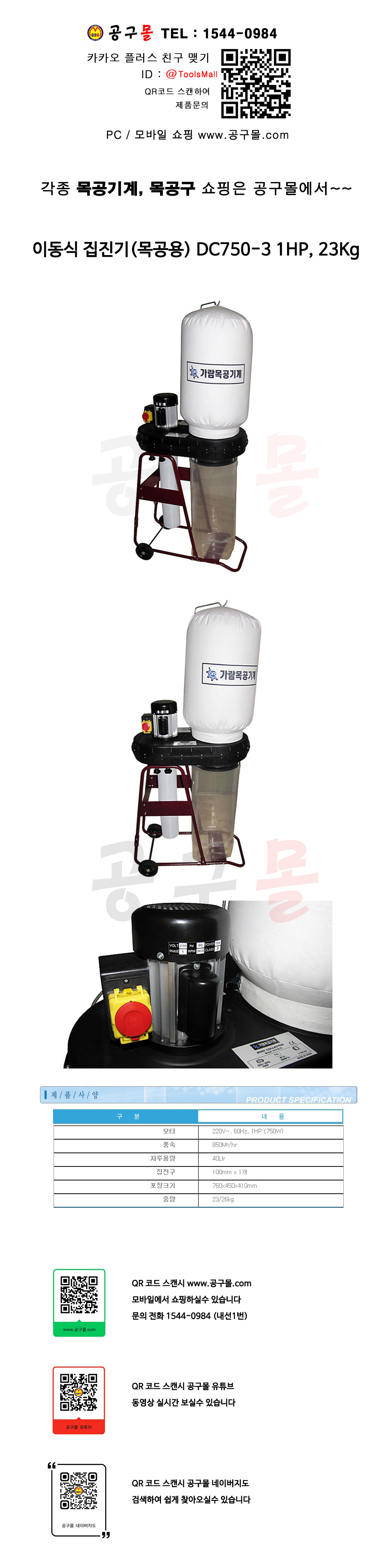 KR산업 이동식 집진기(목공용) DC750-3, 1HP, 23Kg 공구몰, 목공용집진기, 목공기계