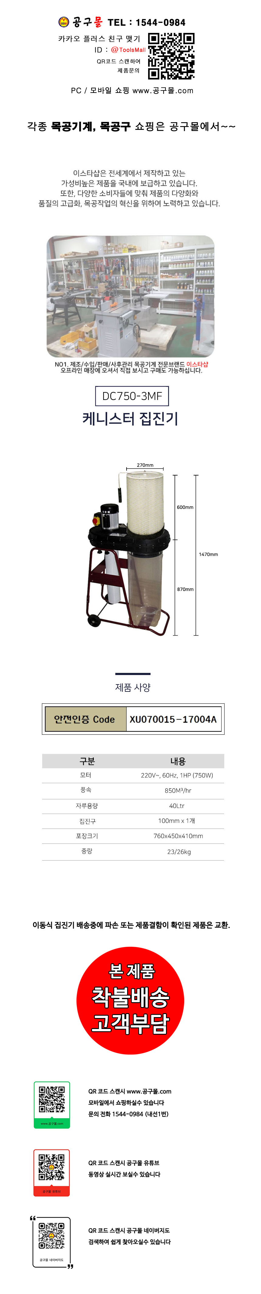 KR산업 케니스터 DC750-3MF 750W, 23Kg 공구몰, 목공용집진기, 목공기계