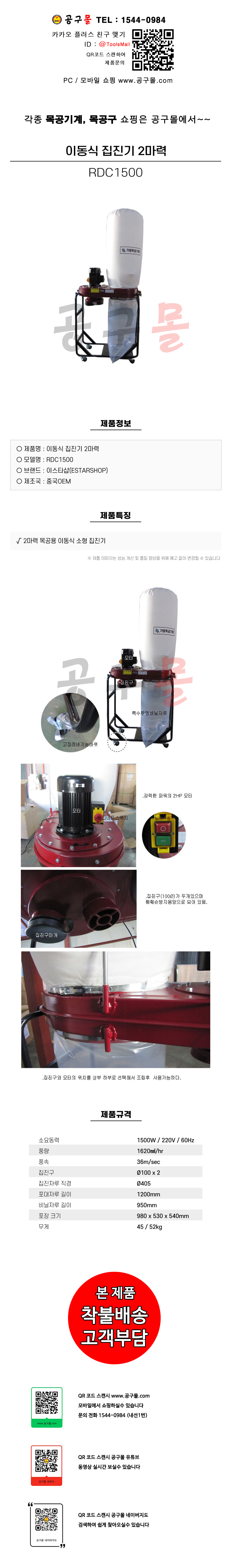 KR산업 이동식 목공용 집진기 RDC1500 2HP,45Kg(220V), 목공기계