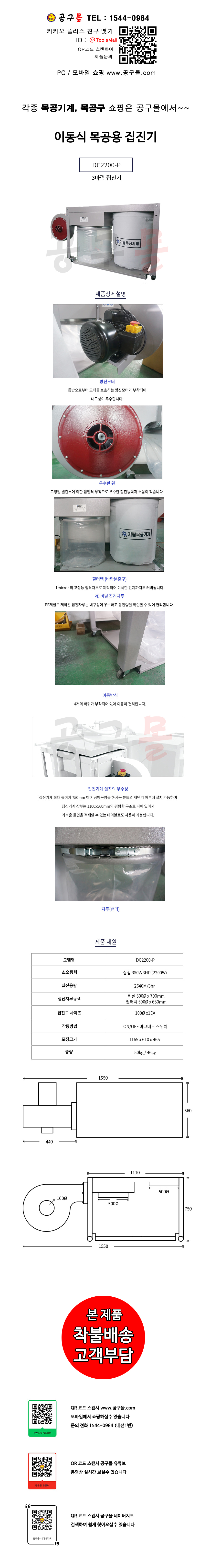 KR산업 이동식 목공용 집진기 DC2200-P 3HP,46Kg(삼상380V) 목공기계