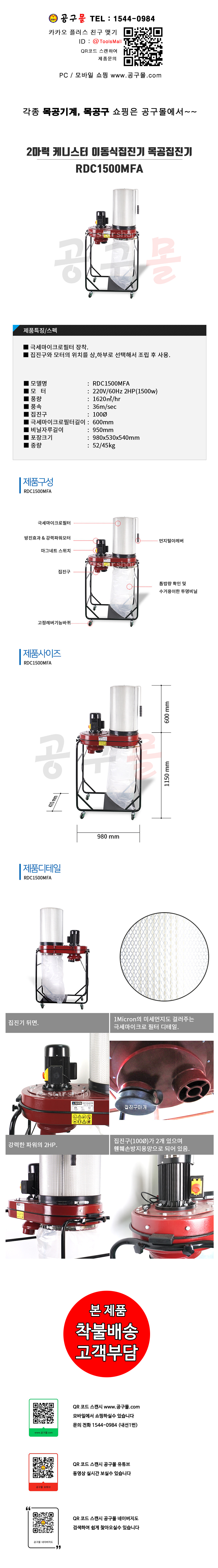 KR산업 이동식 목공용 집진기 RDC1500 2HP,45Kg(220V), 목공기계