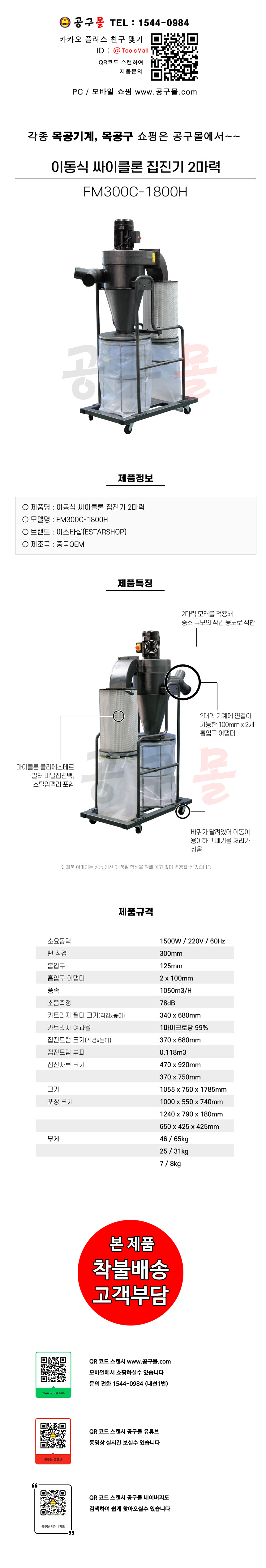 KR산업 이동식 싸이클론 집진기 FM300C-1800H 78Kg,2hp(220V) 목공기계