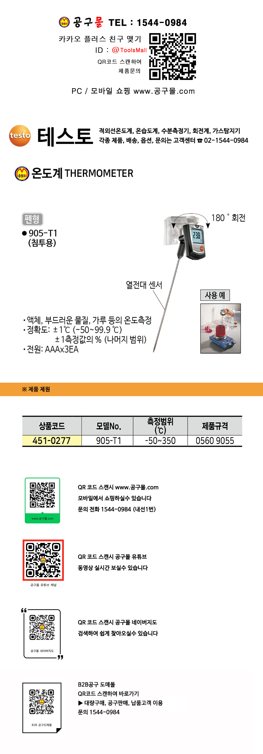 테스토 온도계(침투형) 905-T1 (0560 9055) TESTO, 침투용온도계,451-0277