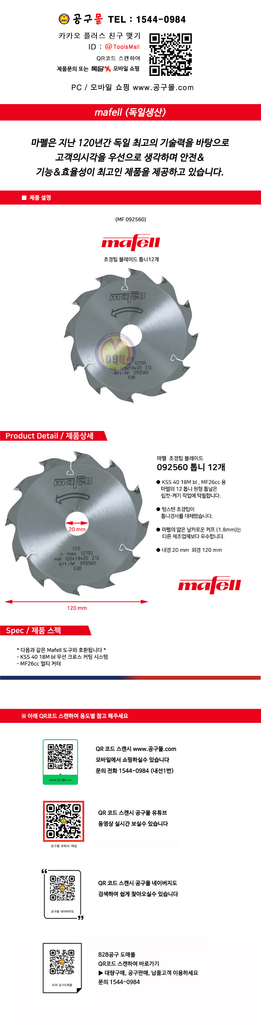 마펠 초경 TCT 원형톱날 120x1.2/1.8x20mmx12T, KSS40 / MF26cc, MAFELL,합판재단, 연목절단, mf-092560