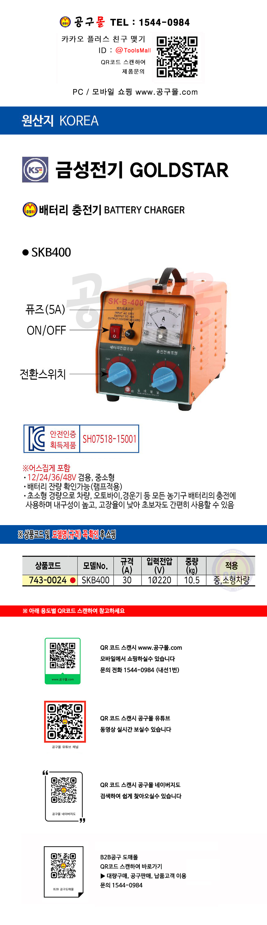 금성전기 배터리충전기 SKB400(중/대형)=(SKB30) 밧데리충전기 743-0024