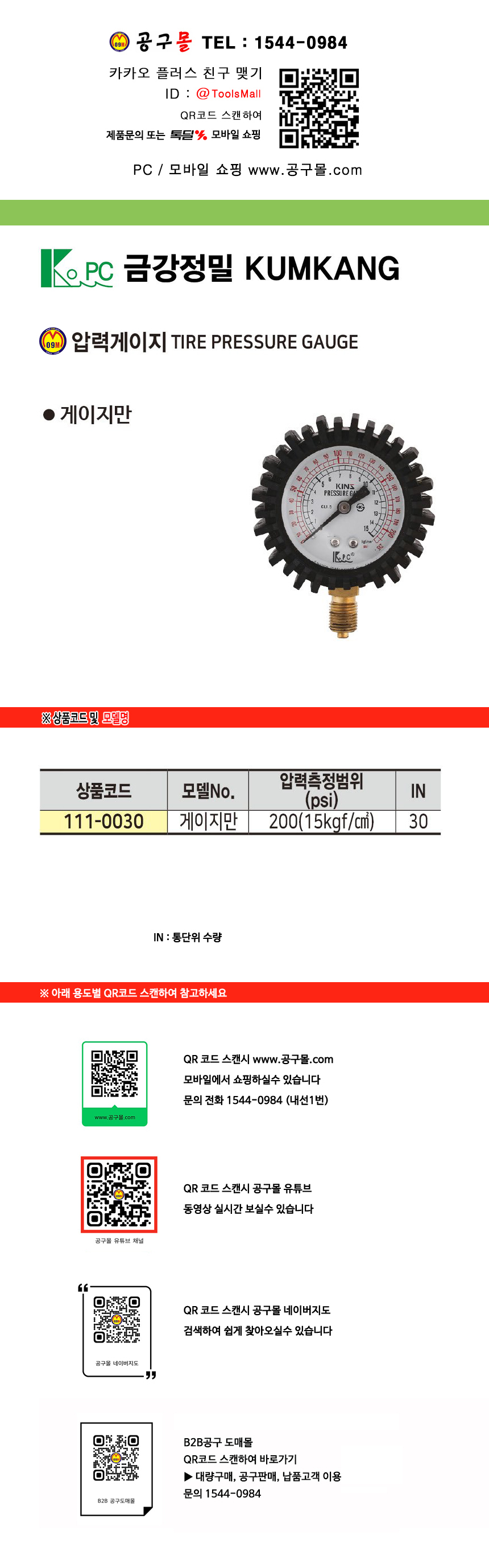 금강정밀 압력게이지 KG768 (15KG/CM2) 게이지만 에어공구, 공구몰 111-0030
