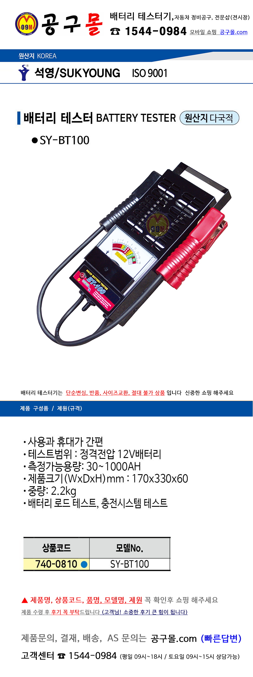 석영기기 배터리테스터 SY-BT100 공구몰, 자동차정비공구, 740-0810