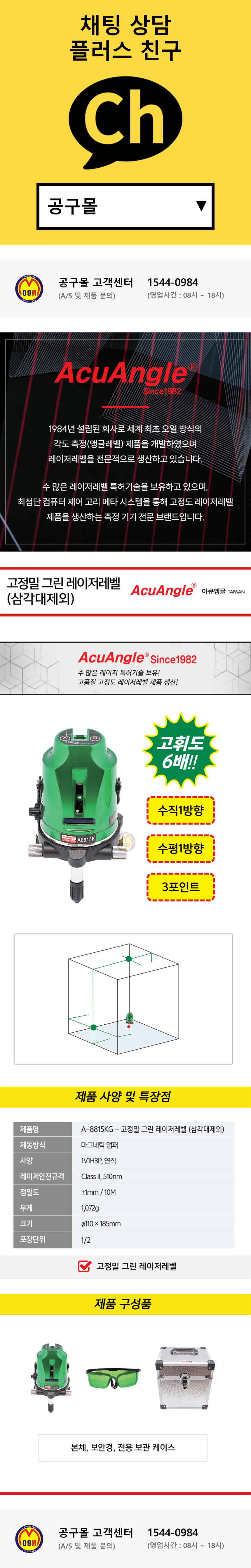 아큐앵글 그린레이저레벨 A-8815KG (6배 수직1수평1포인트3) 그린레벨기 1V1H ACUANGLE