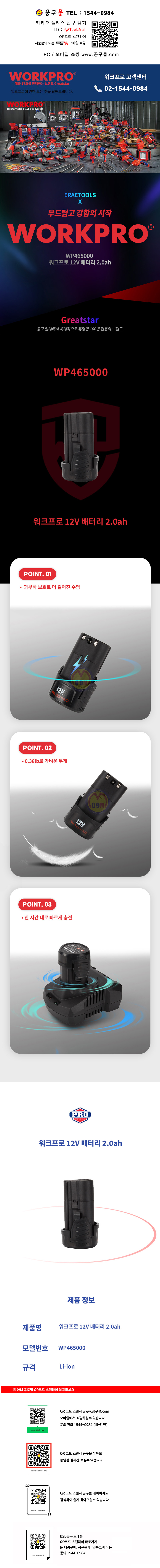 워크프로 12V 배터리 2.0Ah WP465000 WORKPRO 공구몰