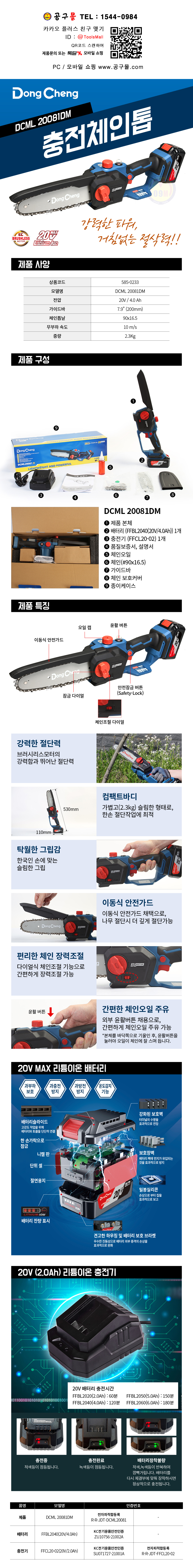 동청 충전체인톱(BL) DCML20081DM (20V 4.0Ah/1B) 200mm(8) DongCheng 공구몰닷컴 585-0233
