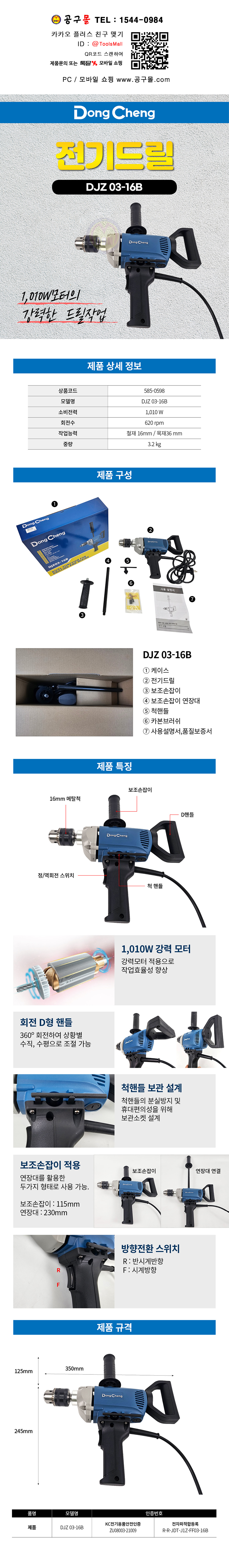 동청 전기드릴 DJZ03-16B (정,역방향) 1010W 620RPM 믹서드릴, DongCheng 공구몰닷컴 585-0598