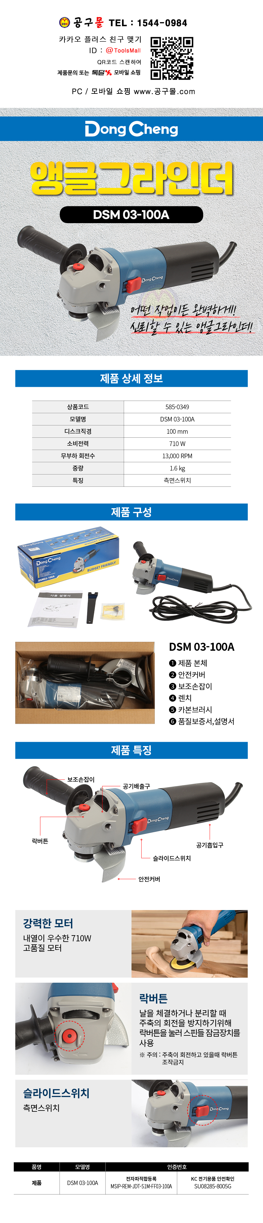 동청 앵글그라인더 DSM03-100A (4) 710W (측면S/W) DongCheng 공구몰닷컴 585-0349