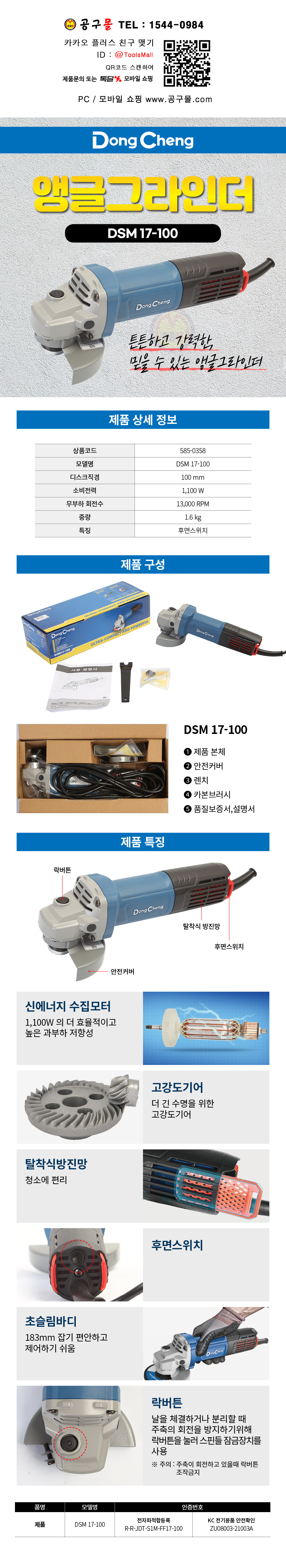동청 앵글그라인더 DSM17-100 (4) 1100W (후면S/W) DongCheng 공구몰닷컴 585-0358