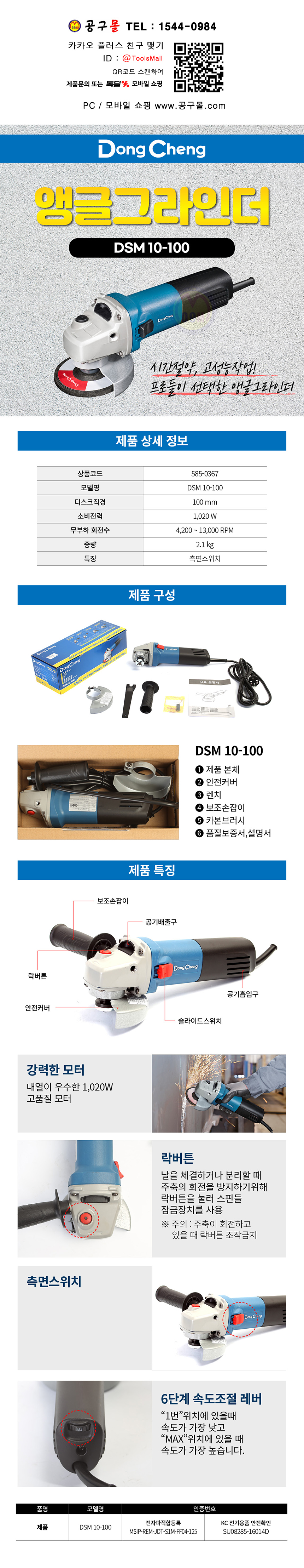 동청 앵글그라인더 DSM10-100 (4) 1100W 속도조절 (측면S/W) DongCheng 공구몰닷컴 585-0367