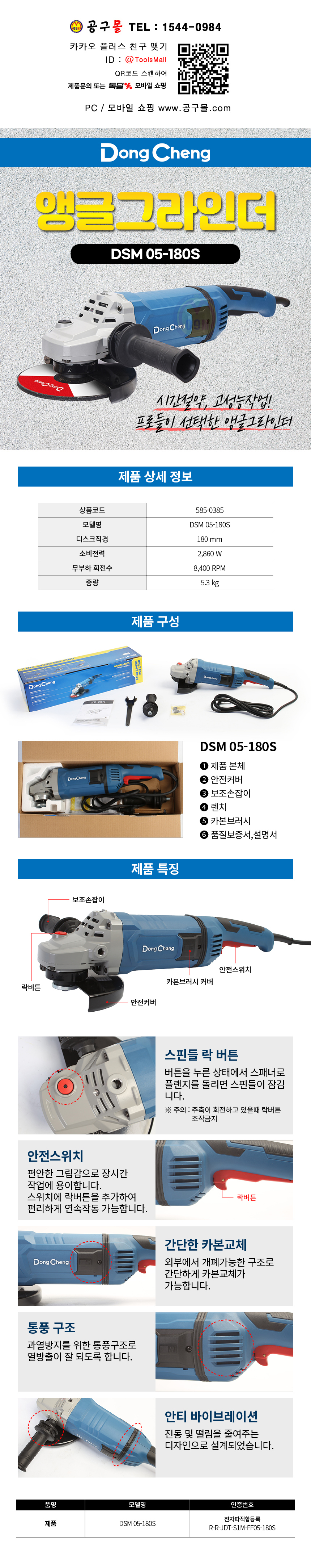 동청 앵글그라인더 DSM05-180S 180mm(7) 2860W DongCheng 공구몰닷컴 585-0385