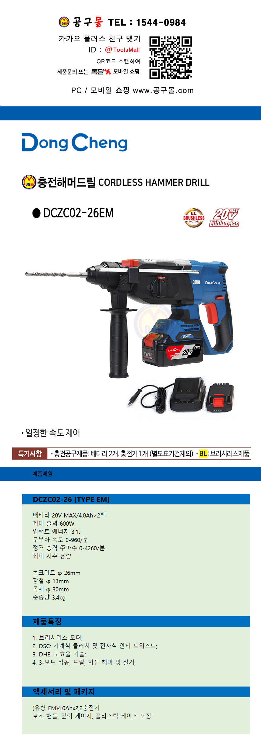 동청 충전해머드릴(BL SDS) DCZC02-26EM 26mm (20V 4.0Ah,2B) DongCheng 공구몰닷컴 585-0163