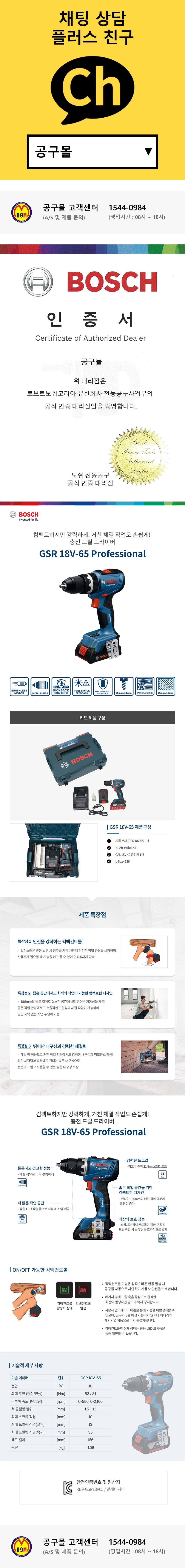 보쉬 충전드릴드라이버 GSR18V-65 (18V-2.0AH) 무선드릴 가정용
