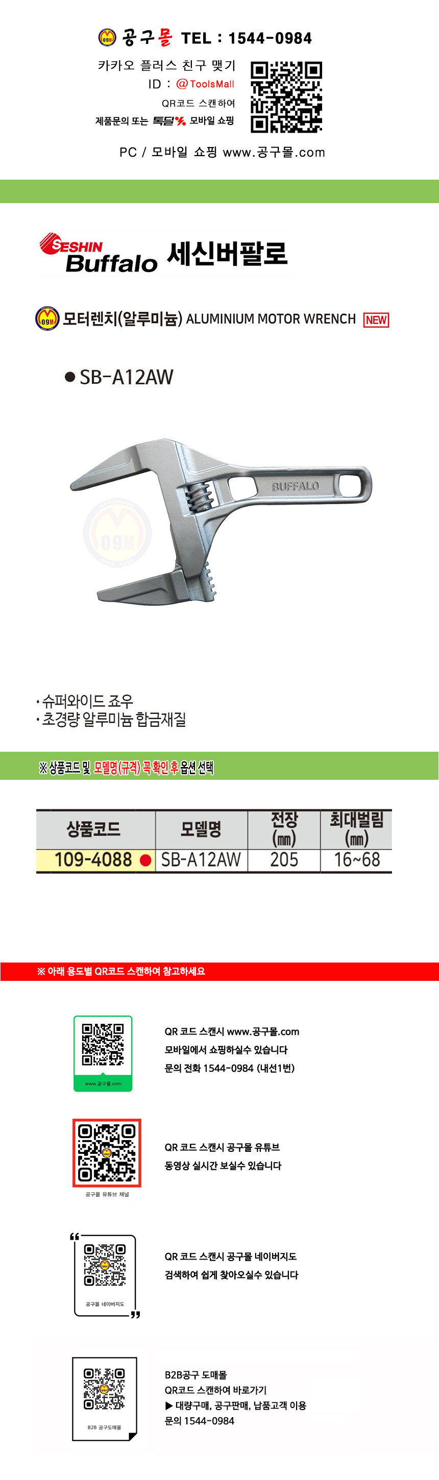 세신 모터렌치(알루미늄) SB-AMW68 몽키스패너, SESHIN BUFFALO, 세신공구, 버팔로 공구몰 109-4088