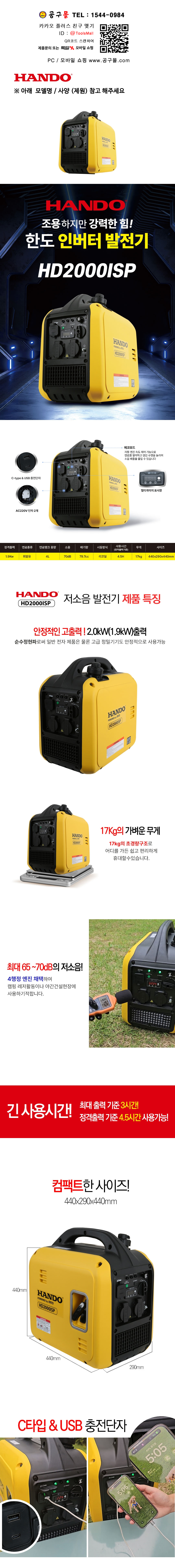 한도 인버터발전기 HD2000ISP 2.0(1.9)Kw 4L 17kg 70dB HANDO 공구몰 681-4085