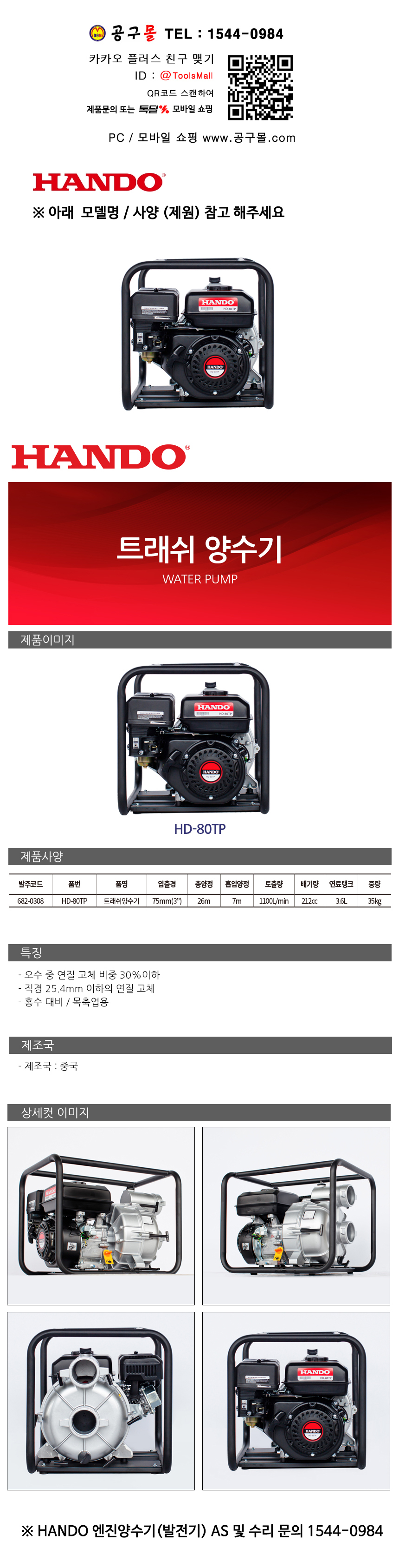 한도 4행정 트래쉬양수기 HD-80TP (75mm) 35kg 212cc 6.0HP HANDO 공구몰닷컴 682-0308