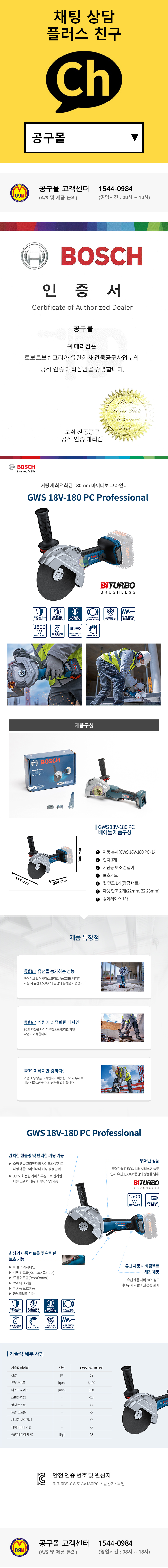 보쉬 충전그라인더 GWS18V-180PC (18V-베어툴-180mm) 절단기