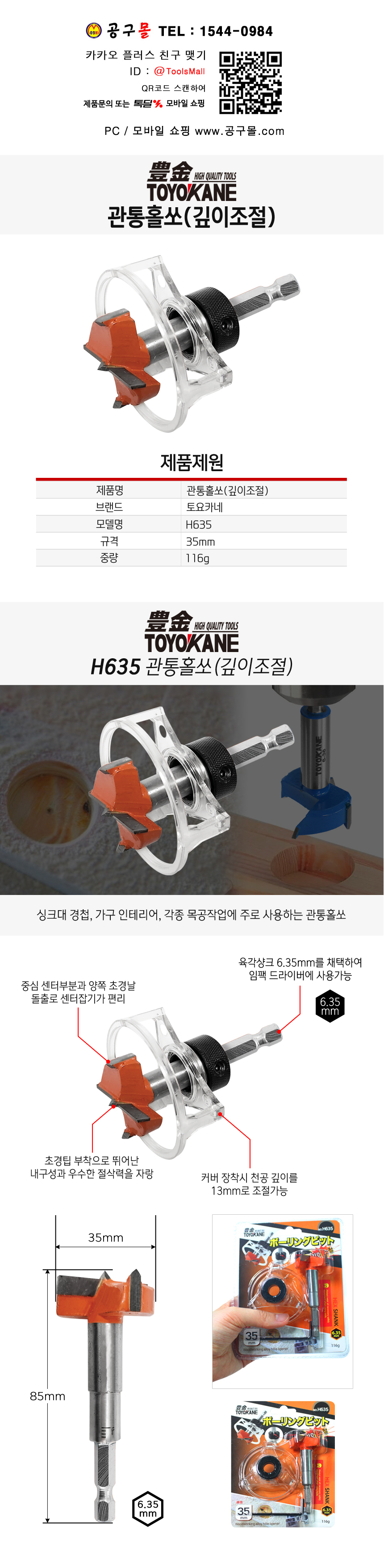 토요카네 관통홀쏘(깊이조절) 루타날 H635 6.35mm x 직경35mm 씽크홀쏘 , 홀커터 TOTOKANE, 공구몰 120-6002