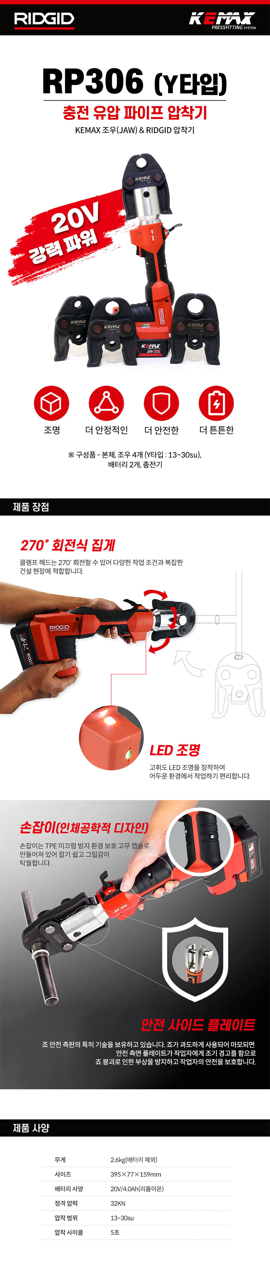 케맥스 충전배관압착기(SET) RP306-Y 13-30SU 20V 6.0Ah 2팩 Y타입 배관공구 RP306Y-30SU