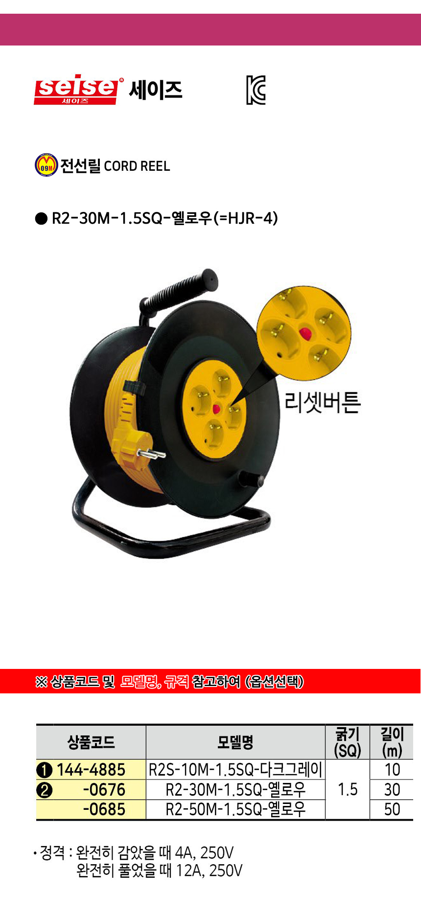 세이즈 전선릴(접지,차단형) R2 IP-50M-1.5SQ-옐로우(=HJR-106) seise, 코드릴, 공구몰 144-0700