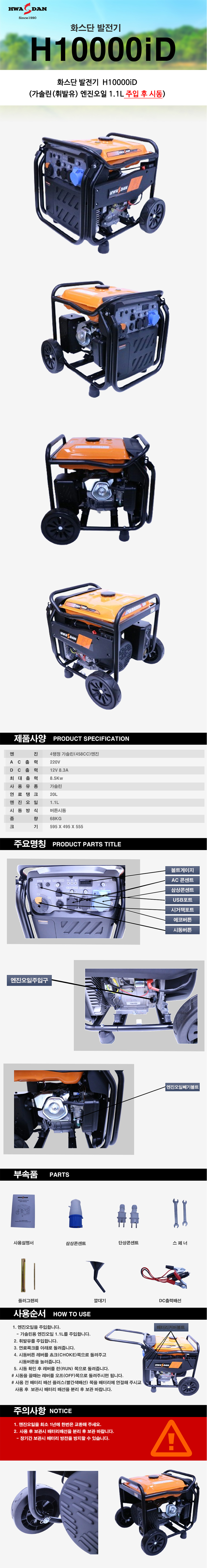 화스단 4행정 발전기 H10000iD 8.5Kw-68Kg 공랭H460엔진 4사이클발전기 공구몰