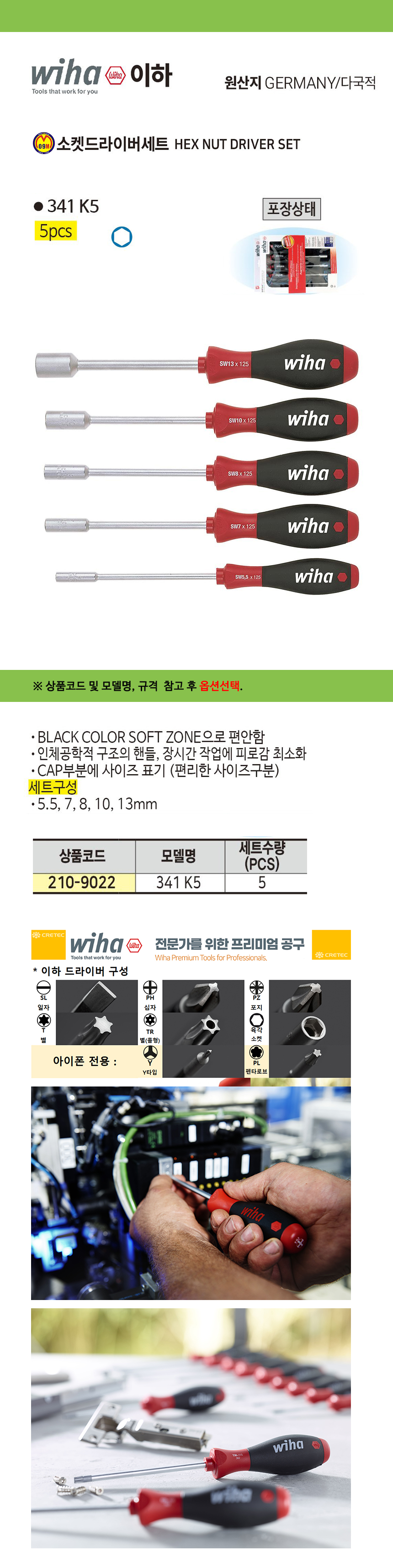 이하 소켓드라이버세트 341 K5, 5Pcs (5.5mm-13mm) wiha 복스드라이버 렌치 공구몰 210-9022
