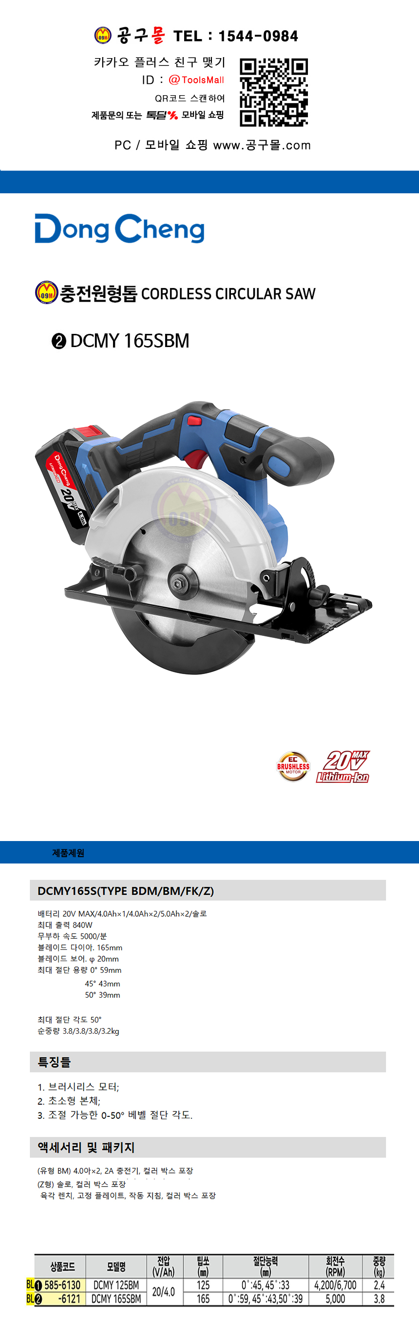동청 충전원형톱 DCMY165SBM (20V/4.0Ah) 배터리2개 DongCheng 공구몰 585-6121