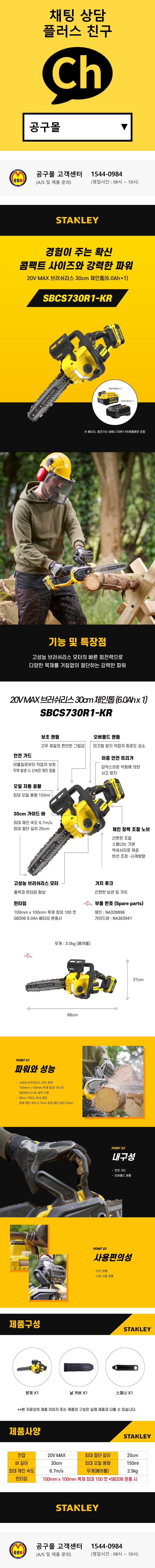 스탠리 20V MAX 충전체인톱 SBCS730R1 (20V-6AH 1개세트) 가지치기 충전톱