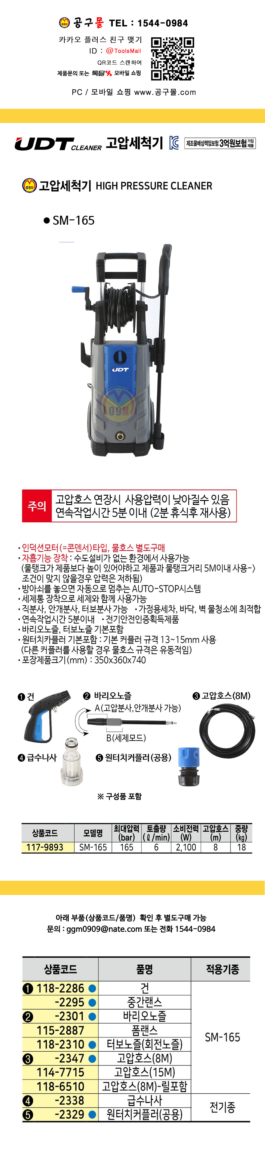 UDT 고압세척기 SM-165 (165바,호스8M) 2100W / 18Kg 공구몰 117-9893