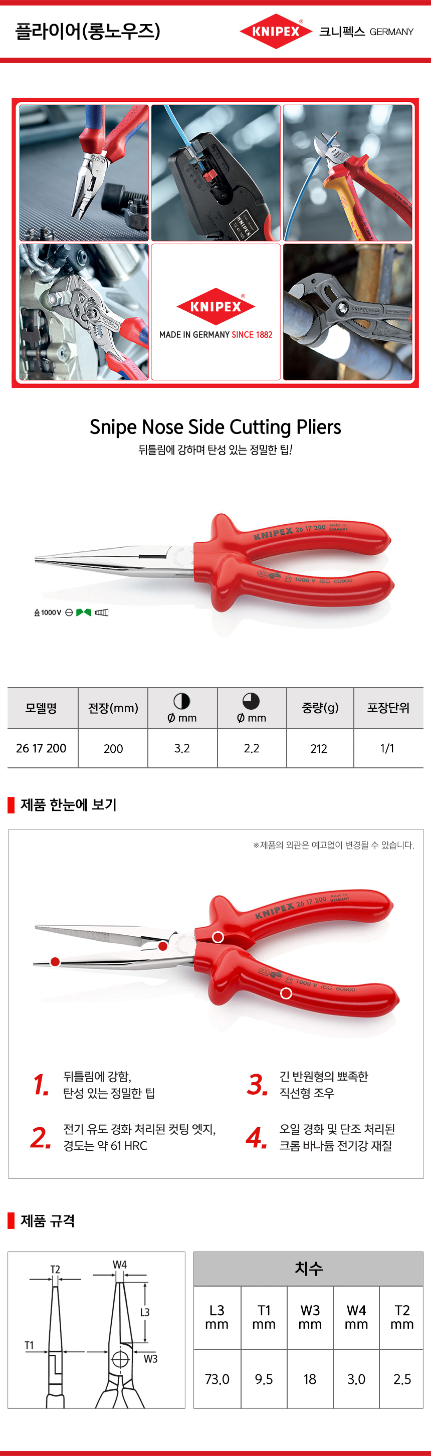 크니펙스 플라이어(롱노우즈) 26-17-200 (200mm) KNIPEX, 크니펙스, 공구몰, 101001020091