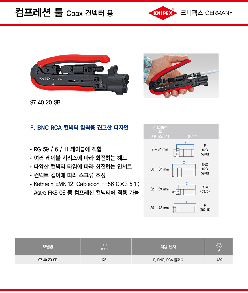 크니펙스 압착기 (컴프레션툴) 97-40-20SB coax 컨넥터용 rg케이블 길이조절 KNIPEX 독일공구, 수공구, 공구몰추천 101021530161