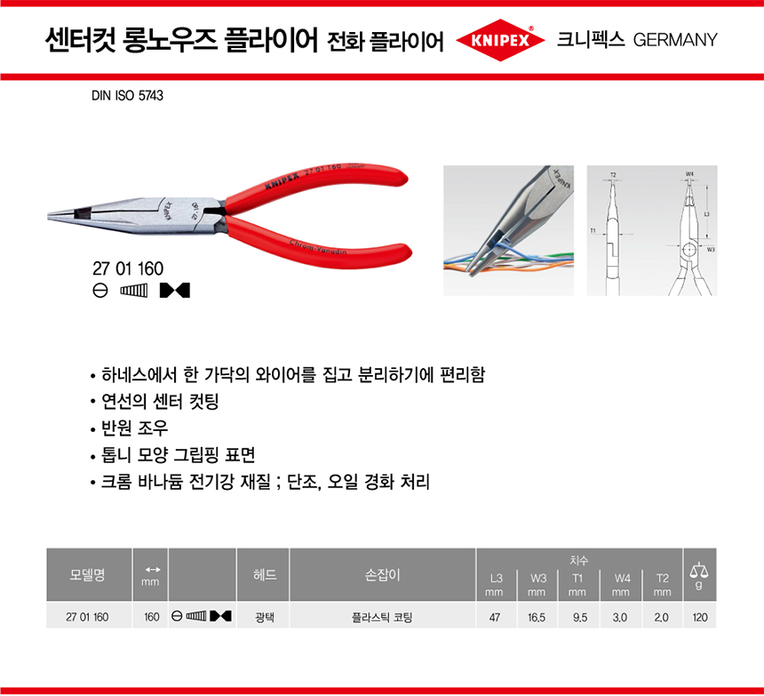 크니펙스 플라이어(롱노우즈) 27-01-160 KNIPEX 독일공구, 수공구, 공구몰추천 101001020101