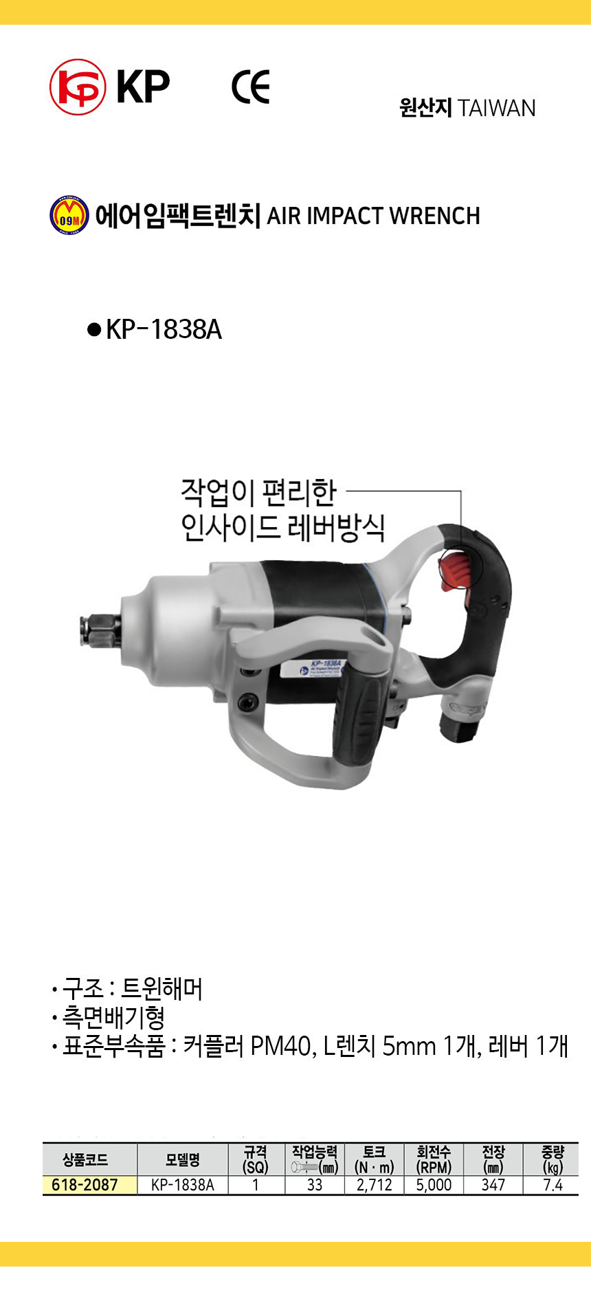 KP 에어임팩트렌치 KP-1838A(1SQ)일자형,숏타입 에어공구, 에어임팩렌치 공구몰 618-2087