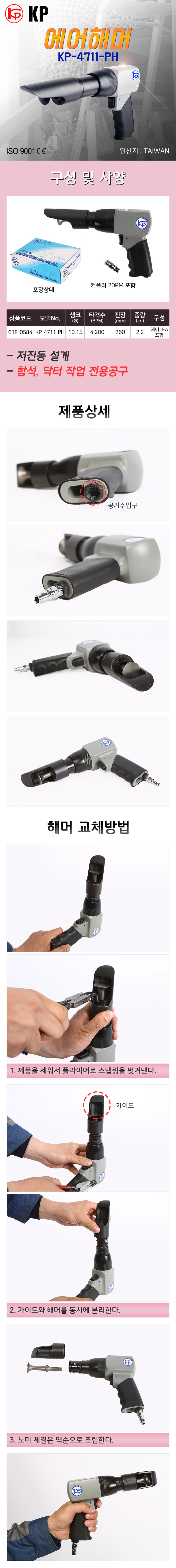 KP 에어해머 KP-4711PH 샹크10.15mm 260mm 2.2Kg 에어공구, 에어해머, 다가네 공구몰 618-0584