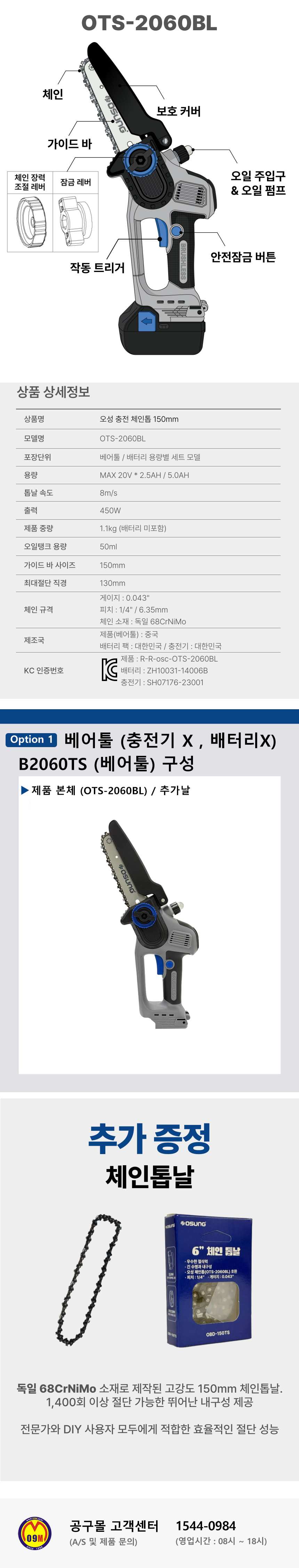 오성 20V 충전체인톱 OTS2060BL (20V-2.5AH-150mm) 미니체인톱 가지용