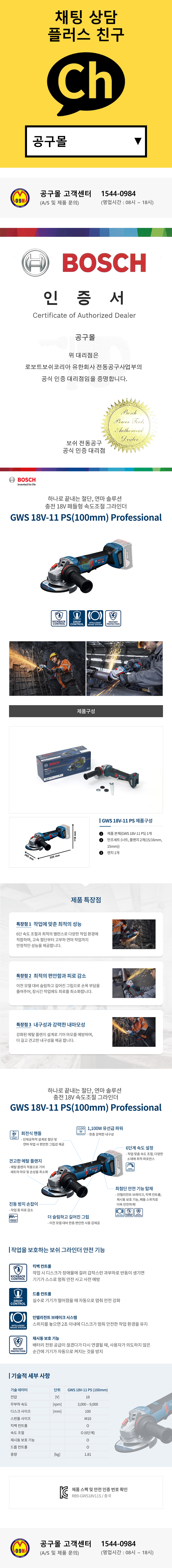 보쉬 충전그라인더 GWS18V-11PS (18V-베어툴-속도 조절) 앵글그라인더