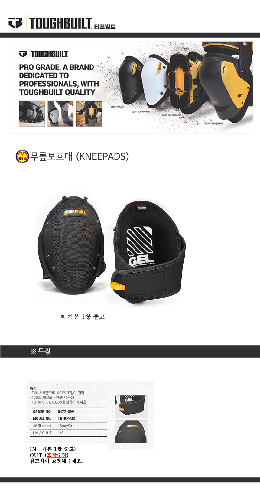 터프빌트 무릎보호대 TB-KP-G2 (1쌍) 기본품 / 탈부착가능(TOUGH BUILT) 0477399