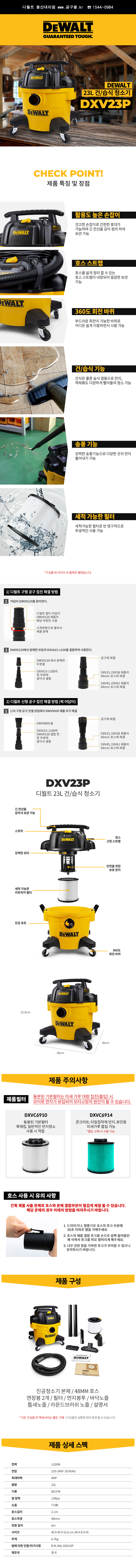 디월트 건.습식 청소기(PVC) DXV23P 1100W, DXV45P 1200W, 송풍, 23L, DEWALT 공구몰, 2370-2312
