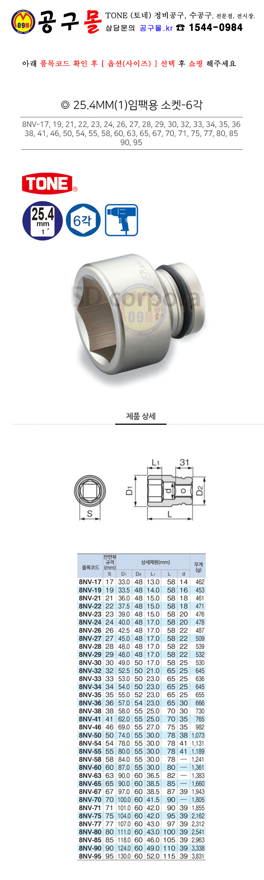 TONE 1inch-6각 임팩소켓(78mm) 8NV-50/55 (50-55mm) 토네, 임팩복스알, 공구몰, 8NV-17