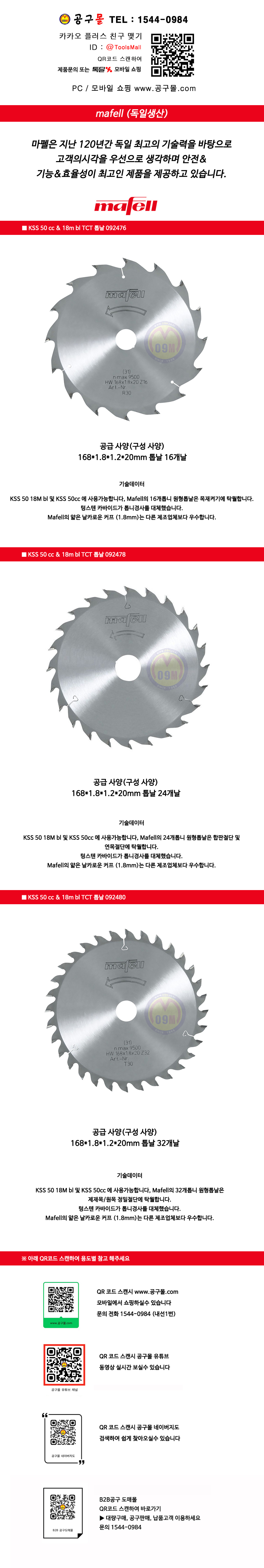 마펠 초경 TCT 원형톱날 168x1.8x1.2x20-/16/24/32/56날, KSS50cc, MAFELL, mf-092478