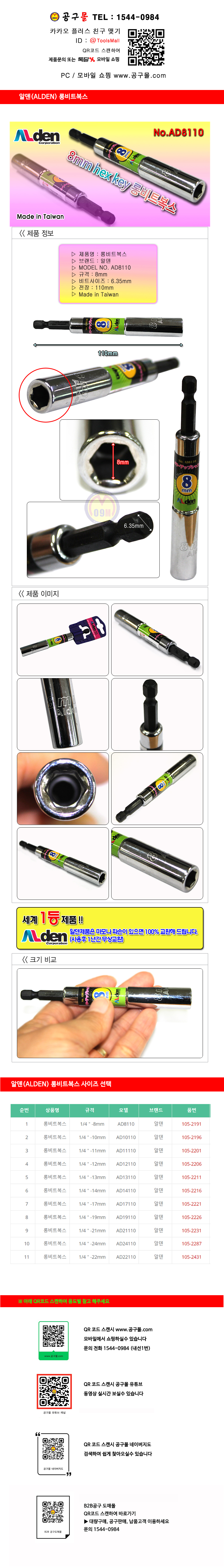 알덴 롱비트복스 1/4-8mm/19mm 전장110mm ALDEN 비트복스,AD8110/AD19110