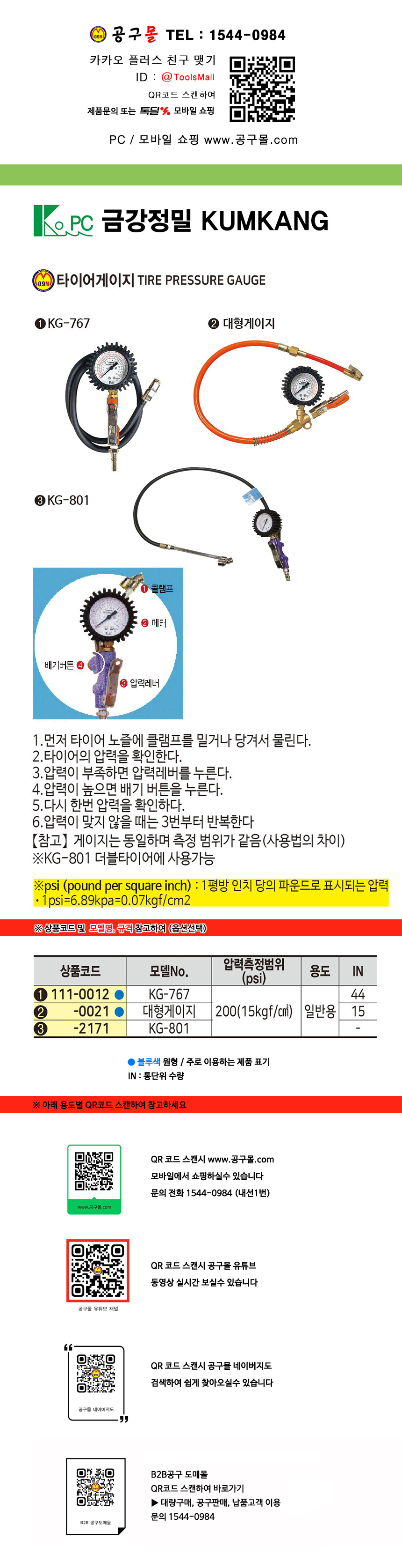 금강정밀 타이어게이지 KG-767,대형, KG-801 에어공구, 공구몰 111-0012