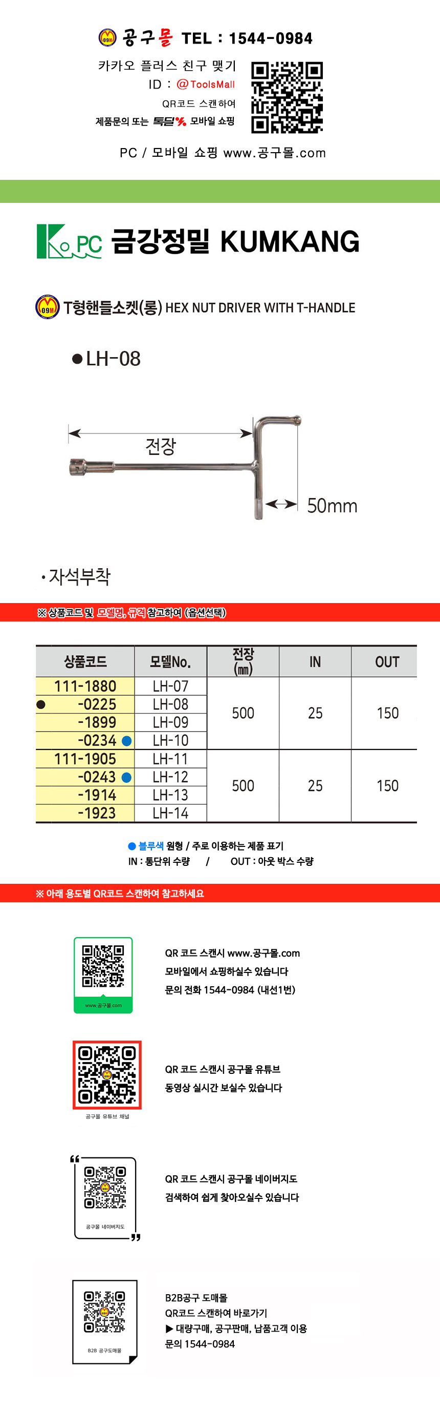 금강정밀 T형핸들소켓(롱) LH-07, LH-14 (500mm) 자석있음, 작업공구, 공구몰 111-1880