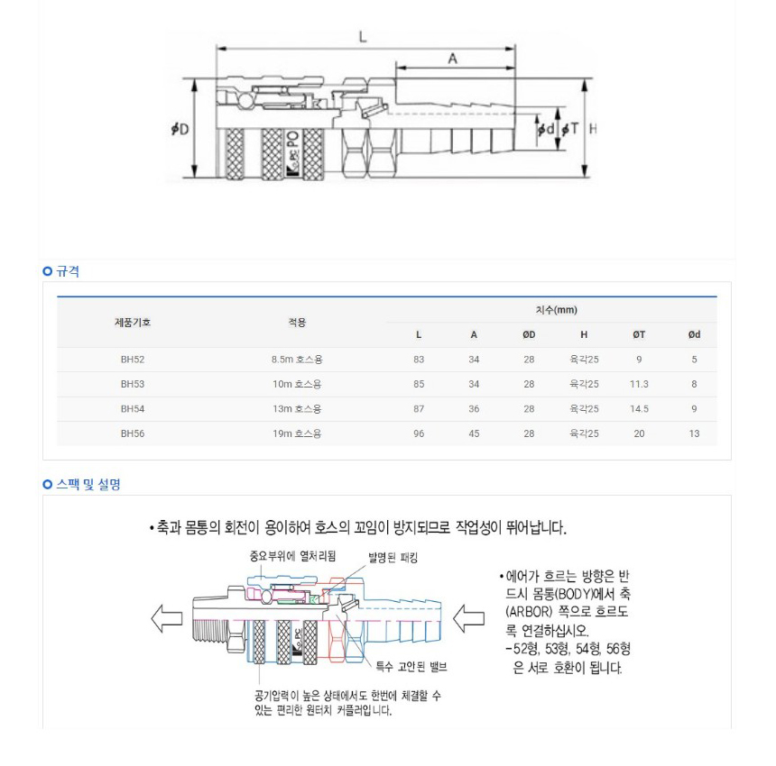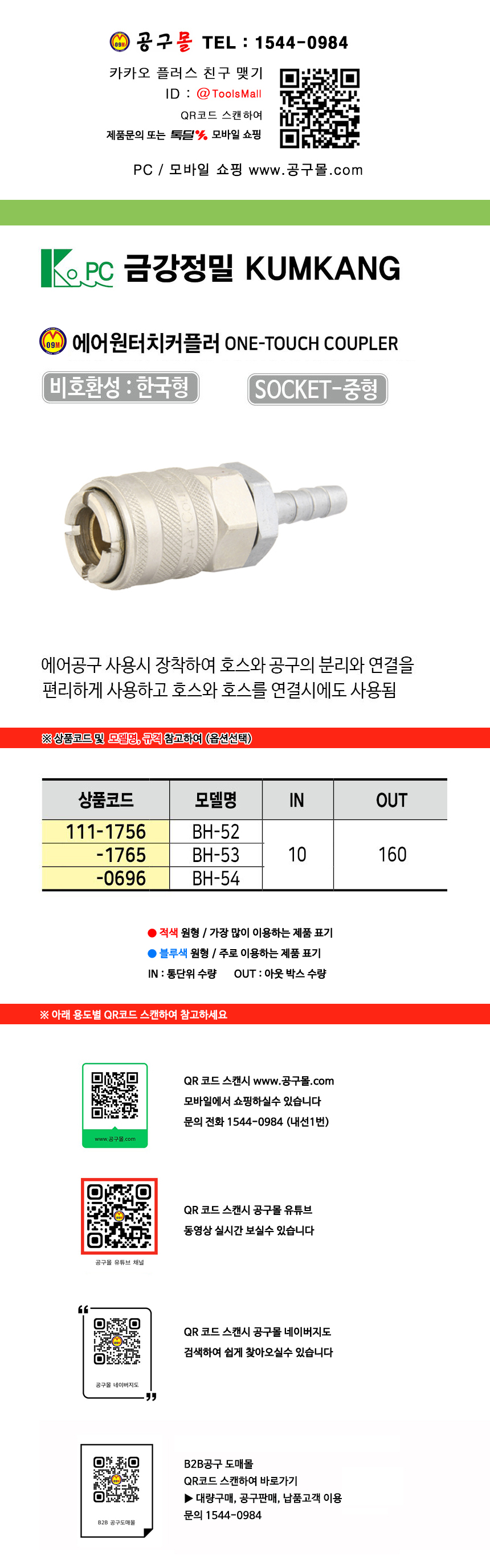 금강정밀 에어원터치 커플러(중형소켓) BH52, BH53, BH54 에어공구, 공구몰 111-1756