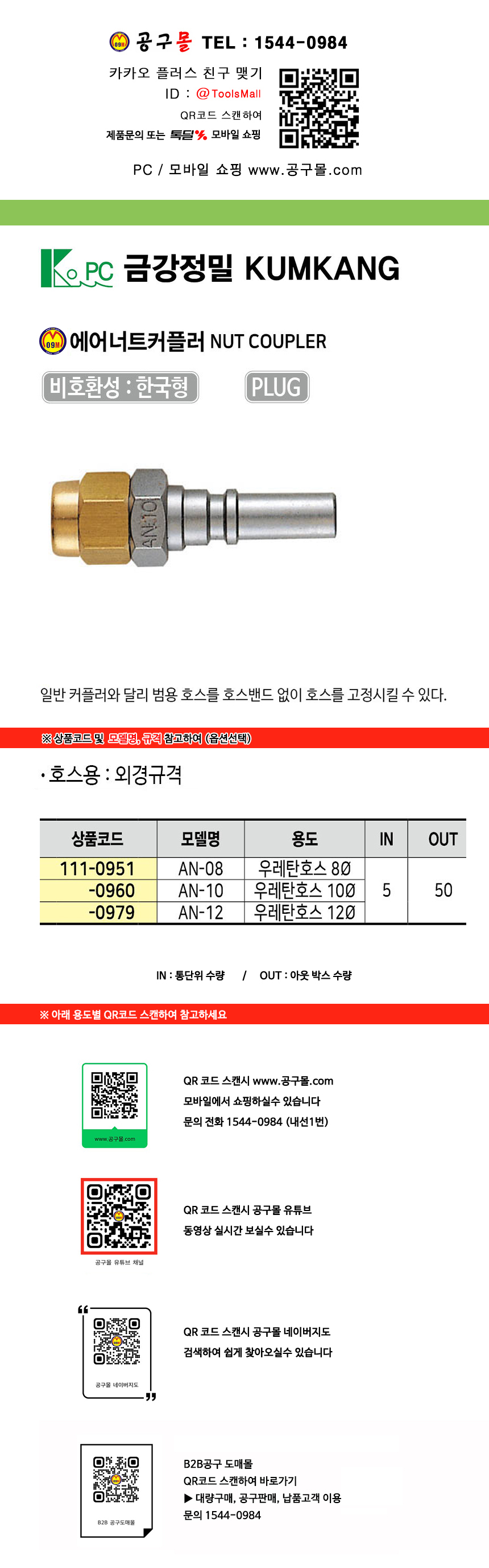 금강정밀 에어너트 커플러(소켓) BN08, BN10, BN12 에어공구, 공구몰 111-0924