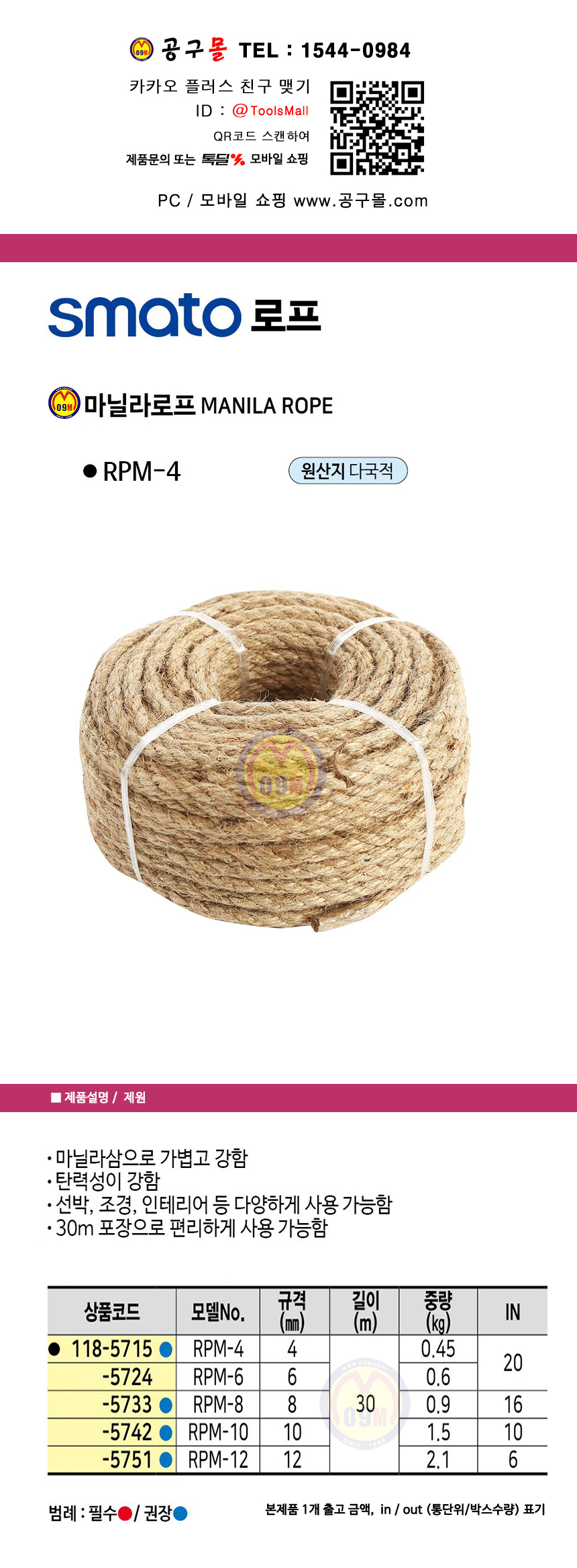 스마토 로프(마닐라로프 30M) RP-M4 / RP-M6/ RP-M8 SMATO, 울산공구몰, 118-5724